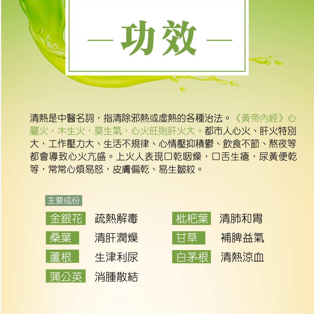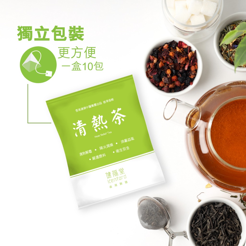 由香港註冊中醫師精心調配,嚴選多種草本植物作為原料,獨立包裝,衛生安全,茶香隨浸泡時間越見濃郁。產品有助迅速清除熱氣,生津潤燥、清心下火。適合燥熱上火人士,特別是經常加班或應酬的上班族,愛吃煎炸、辛辣人士,清熱茶是最佳選擇。