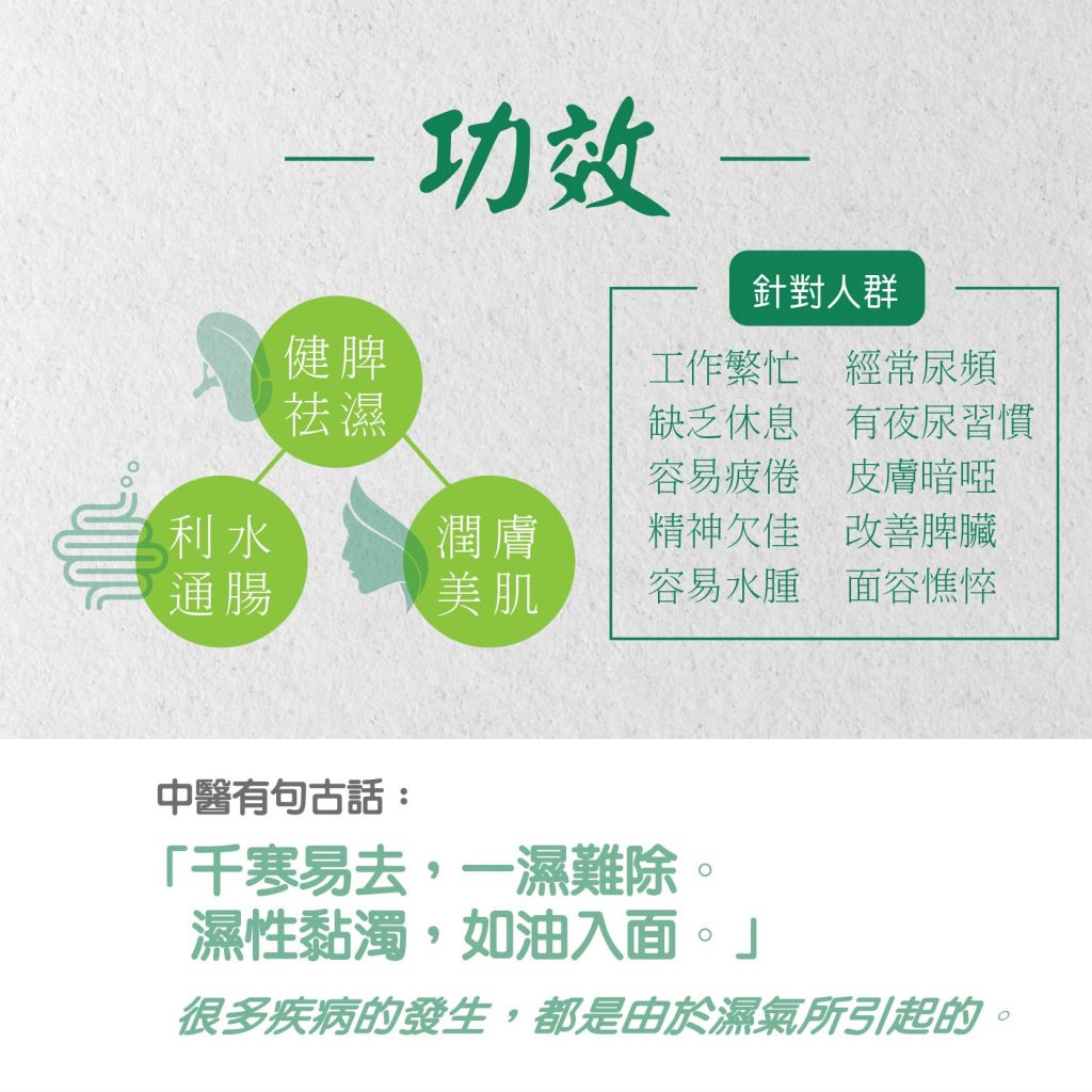 由註冊中醫師精心調配,嚴選多種草本植物原料,獨立包裝,衛生安全,茶香隨浸泡時間越見濃郁。健脾祛濕、利水通腸、潤膚美肌,適合工作繁忙、缺乏休息、容易疲倦、容易水腫上班族飲用。