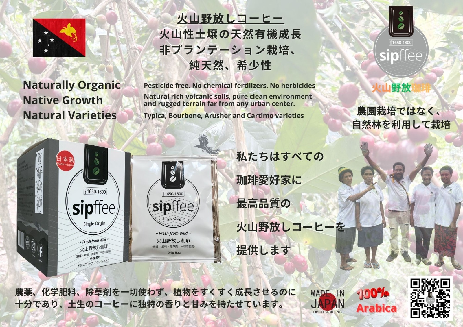 Sipffee咖啡豆為A級野放豆, 經人手採摘後再以傳統方式來處理, 在山間溪流中以人手清洗, 在高原盆地上曬乾, 全程採用太陽日曬, 令咖啡風味更加豐富, 養成了非常特殊的口感。